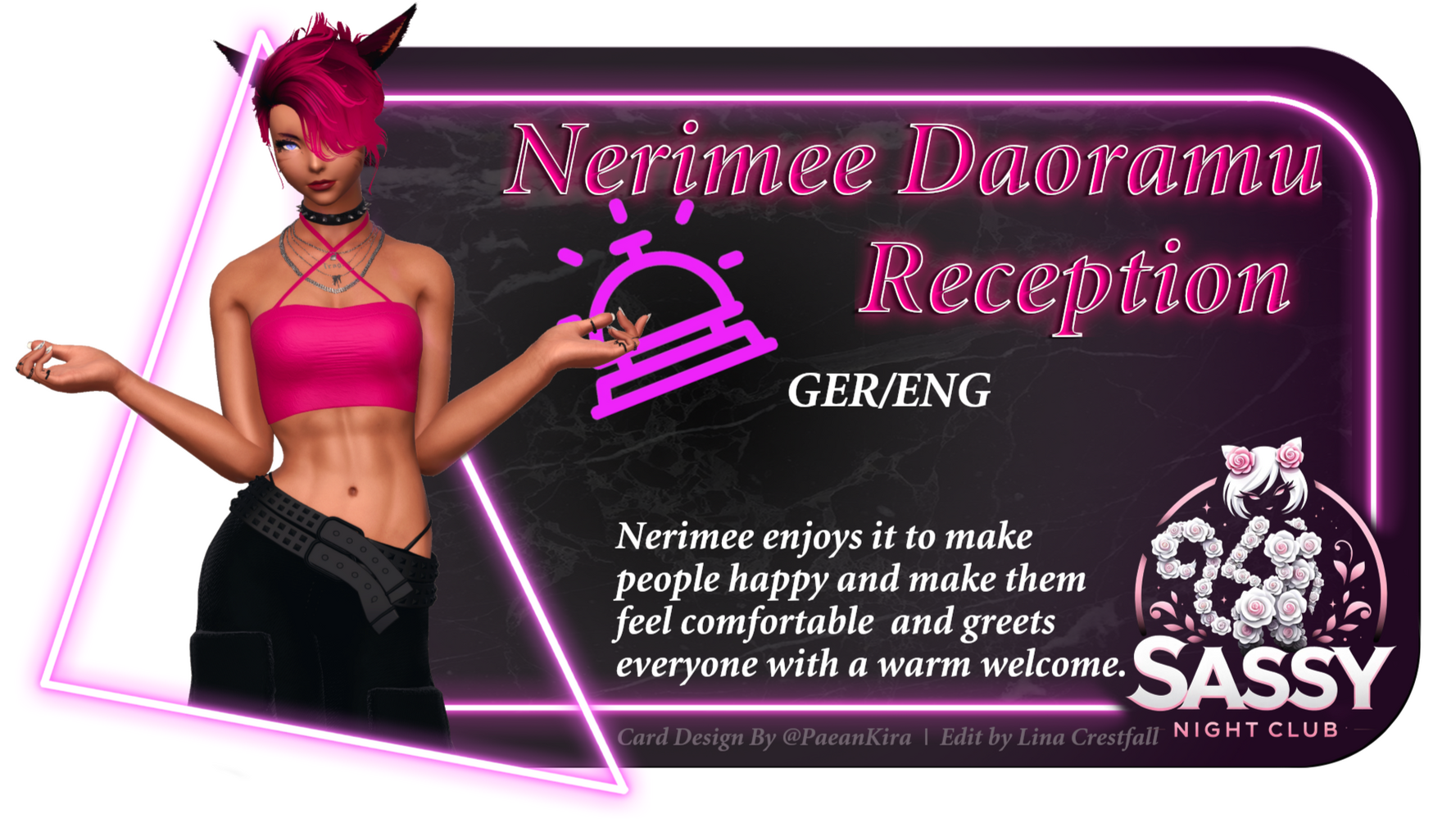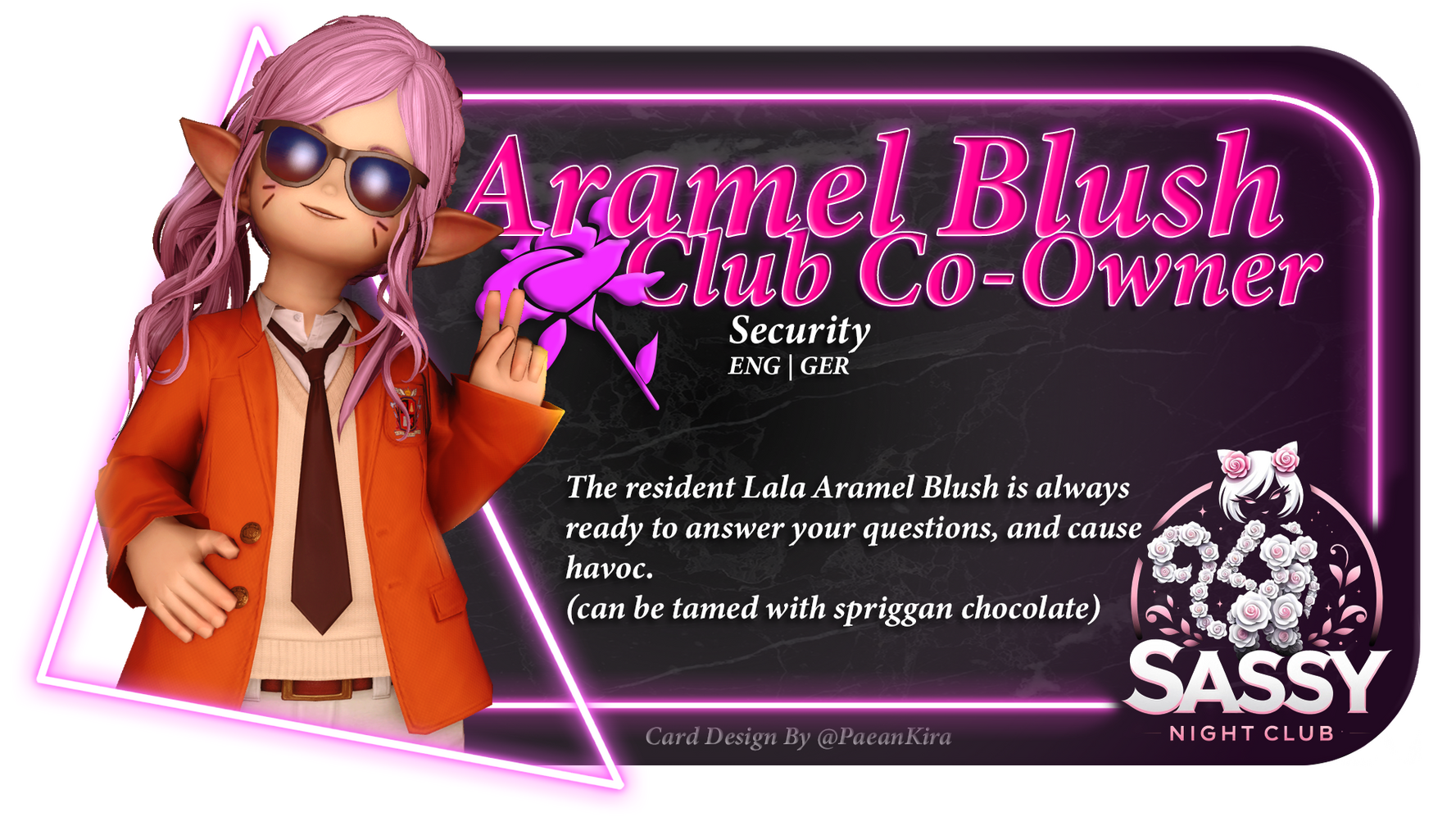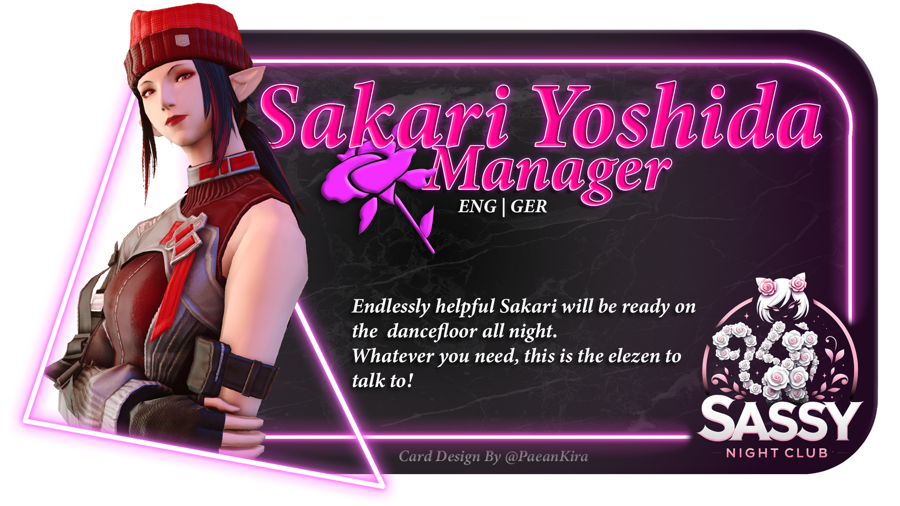 Bio: Sakari broke out from a noble Ishgardian family and decided to try her luck in the Eorzean Nightlife, leaving the royal duties behind. She worked hard to become a manager quickly, met a lot of amazing people and became a well known face in the clubbing scene.