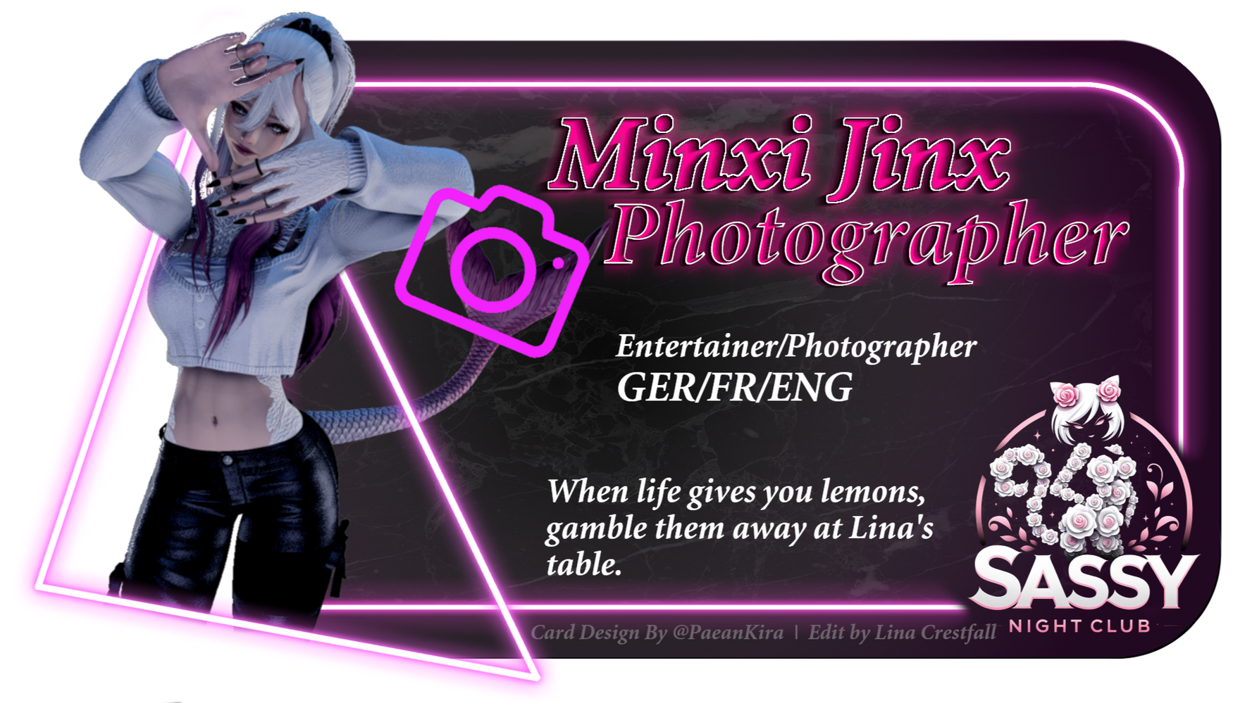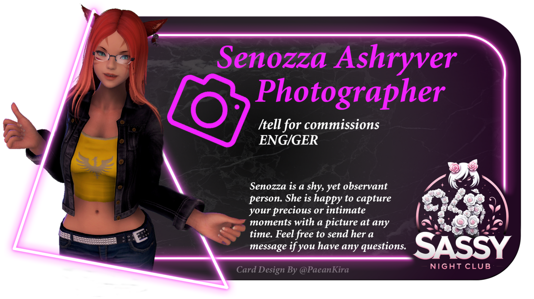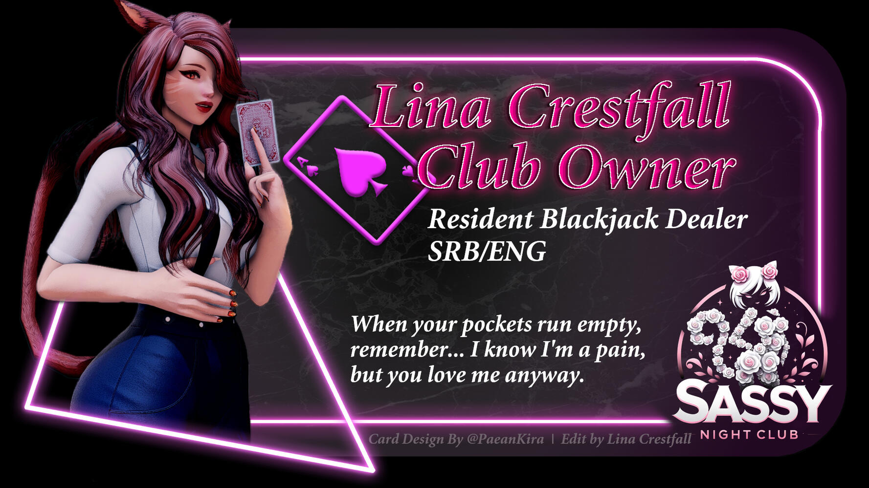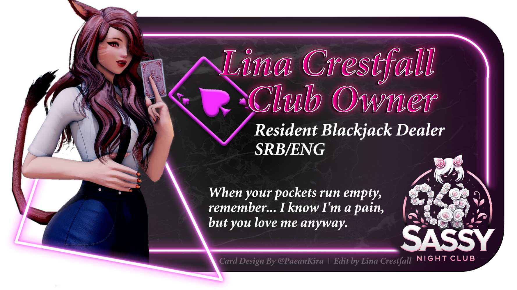 Bio: Lina Crestfall, a Miqo'te with a hellspawn and mortal legacy, saved an innocent and gained a youthful form locked at 25. Despite redemption, she's mischievous and bullies others. Now free, Lina thrives as a mesmerizing and savvy businesswoman in a bustling club.
