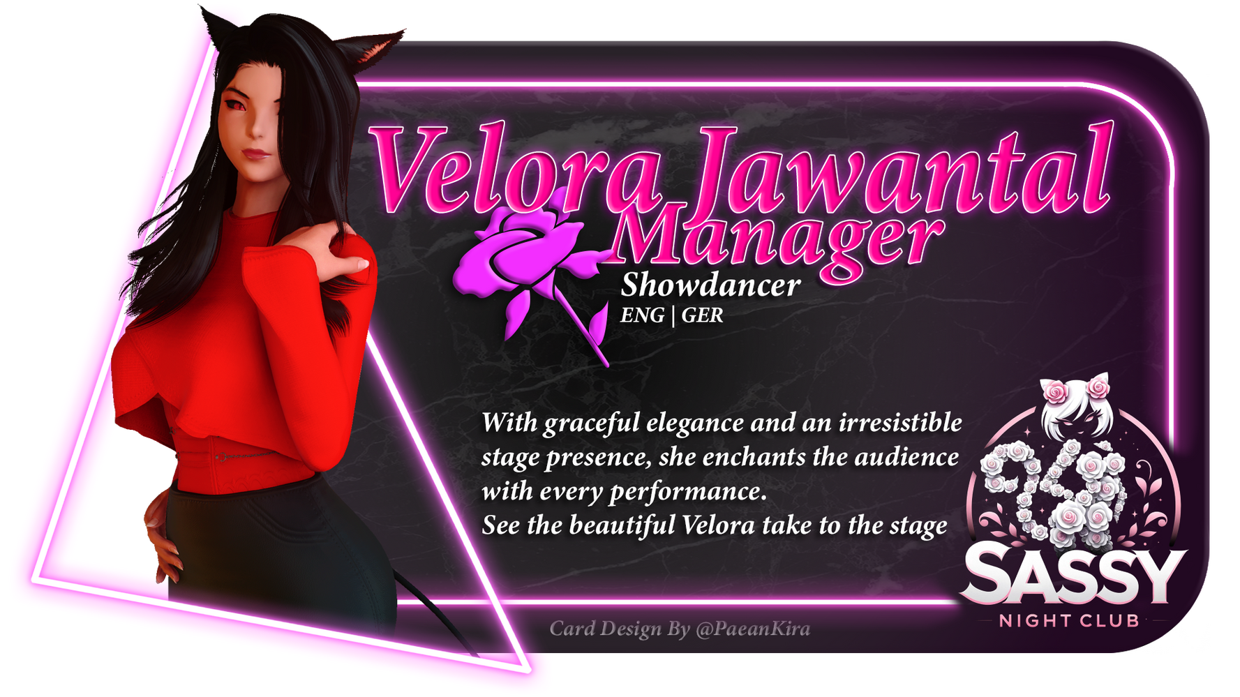 Bio: Velora Jawantal, a Miqo'te born in the City of Gridania, found her calling amidst the vibrant nightlife of Eorzea, transitioning from a daring adventurer to a mesmerizing showdancer. Now, she captivates crowds with her electrifying performances, expertly hyping the atmosphere with her graceful choreography synced to the DJ's beats.